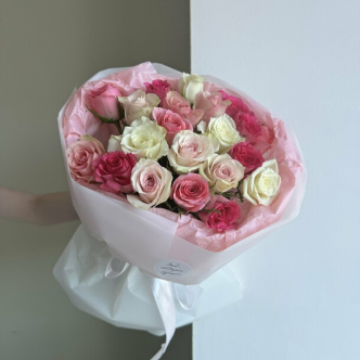 Стоимость букета зависит от количества роз, которое регулируется в меню конструктора с помощью "+/-". При этом, чем больше вы роз заказываете, тем дешевле цена одной розы в букете.